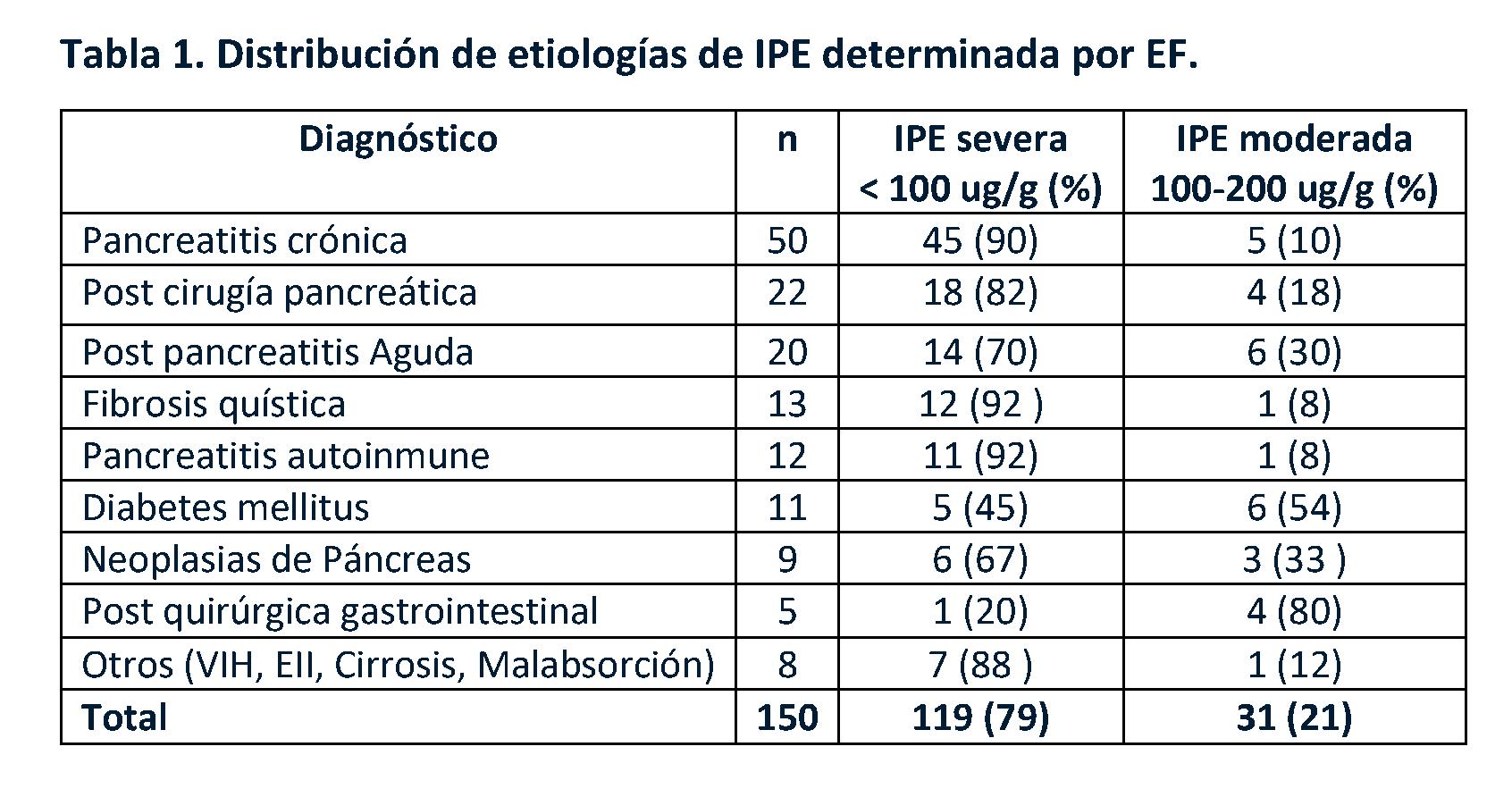 Introducción: La elastasa fecal (EF) es un marcador utilizado para detectar insuficiencia pancreática exocrina (IPE). La etiología de la IPE se clasifica en pancreática o extra pancreática con frecuencias variables en la población. Objetivo: Analizar la distribución etiológica de la IPE determinada por EF e identificar condiciones preanalíticas en su procesamiento. Métodos: Estudio retrospectivo de EF procesadas con ELISA (ScheBo, Alemania) entre 2021-2025. EF normal >200 pg/g, IPE moderada 100-200 pg/g y severa <100 pg/g. Se recopilaron diagnósticos clínicos de pacientes con EF patológica y se evaluó la calidad de la muestra, en las acuosas con resultados patológicos, se sugirió repetir el examen y no fueron consideradas en el análisis de etiologías. Resultados: Se revisaron 1386 resultados, 378 fueron patológicos (330 pacientes). El 79% presentó IPE severa. Se obtuvieron diagnósticos en 150 casos de IPE (tabla 1). La mayoría (78%) se atribuyó a disminución de producción de enzimas pancreáticas. En 76 (23%) se recomendó repetir EF por muestra acuosa, sólo 12 repitieron, confirmándose IPE en 6. Conclusión: La IPE se concentró en pancreatitis crónica, cirugía pancreática y secuelas de pancreatitis aguda. Predominó la IPE severa, lo que enfatiza la importancia de su detección para iniciar reemplazo enzimático. La calidad de la muestra es un factor importante, encontramos baja adherencia a repetir el examen, lo que debe considerarse porque se observaron cambios en los resultados.
