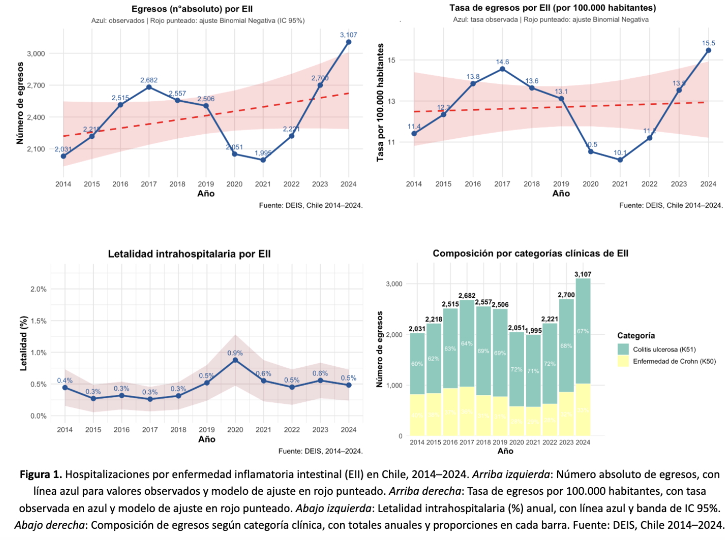 INTRODUCCIÓN: La enfermedad inflamatoria intestinal (EII) ha tenido una carga creciente a nivel global. En Chile, los registros administrativos permiten evaluar su carga hospitalaria y la evolución temporal de esta. OBJETIVOS: Describir la epidemiología de las hospitalizaciones por EII en Chile entre 2014 y 2024. MÉTODOS: Estudio descriptivo de egresos nacionales del DEIS. Casos con diagnóstico principal por EII según CIE-10. Se calcularon frecuencias, tasas, letalidad y distribución por edad y sexo. Análisis de tendencia con binomial negativa. RESULTADOS: Entre 2014-2024 se registraron 26.583 egresos por EII, aumentando de 2.031 a 3.107 (+52,96%), mientras que la tasa de hospitalizaciones aumentó de 11,4 a 15,5/100.000 hab (+35,96%). El 55,1 % correspondió a mujeres y la mayor carga se concentró en 20-39 años (40,5%), seguida de 40-59 años (26,0 %). La colitis ulcerosa fue el diagnóstico más frecuente (66,9 %), seguida por la enfermedad de Crohn (33,1%). La letalidad global fue de 0,45%, con un máximo de 0,88% en 2020. El análisis de tendencia con un modelo de binomial negativa mostró un aumento de 1,7% anual en los egresos absolutos, pero con un aumento en la tasa de 0,36% anual sin significancia estadística (p=0,77). CONCLUSIÓN: Entre 2014 y 2024 se observó un aumento de las hospitalizaciones por EII, sin un aumento significativo de la tasa poblacional. La letalidad global fue baja, con un pico relativo durante 2020. La carga se concentró principalmente en adultos jóvenes de 20 a 39 años, con predominio del sexo femenino y de la colitis ulcerosa.
