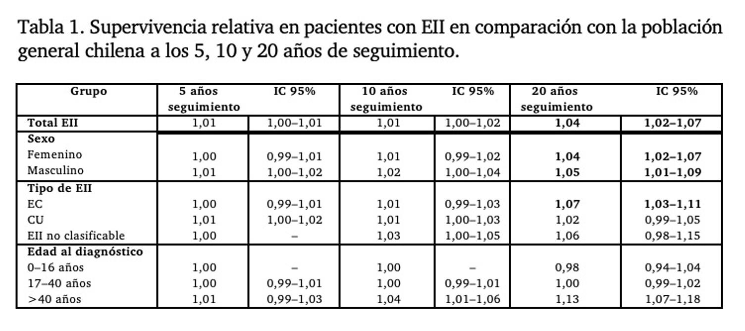 MÉTODOS: Se incluyeron pacientes atendidos en un centro terciario de referencia entre 1990-2020. Se registraron defunciones mediante certificados oficiales. La SR se comparó con la población general chilena utilizando el método Ederer II (RELSURV, R). RESULTADOS: Se analizaron 1.289 pacientes (40,9% hombres, edad media al diagnóstico 35,9 años). La cohorte incluyó 50,2% colitis ulcerosa (CU), 43,1% enfermedad de Crohn (EC) y 6,7% EII no clasificable. Fallecieron 106 pacientes en este periodo (8,9%) con un seguimiento de 22.525 pacientes-año. La SR a 20 años fue superior a la esperada (1,04; IC95% 1,02-1,07; Figura 1) los cual fue observado en ambos sexos, en EC (pero no CU), y en mayores de 40 años (Tabla 1). Las principales causas de muerte fueron cáncer (34%), infecciones (27,7%) y enfermedades cardiovasculares (21,3%). CONCLUSIÓN: Esta cohorte chilena muestra una mayor supervivencia a largo plazo en comparación con la población general. La vigilancia estrecha podría explicar este hallazgo. Las causas de muerte coinciden con otras series internacionales, reforzando la necesidad de estrategias preventivas en Latinoamérica.