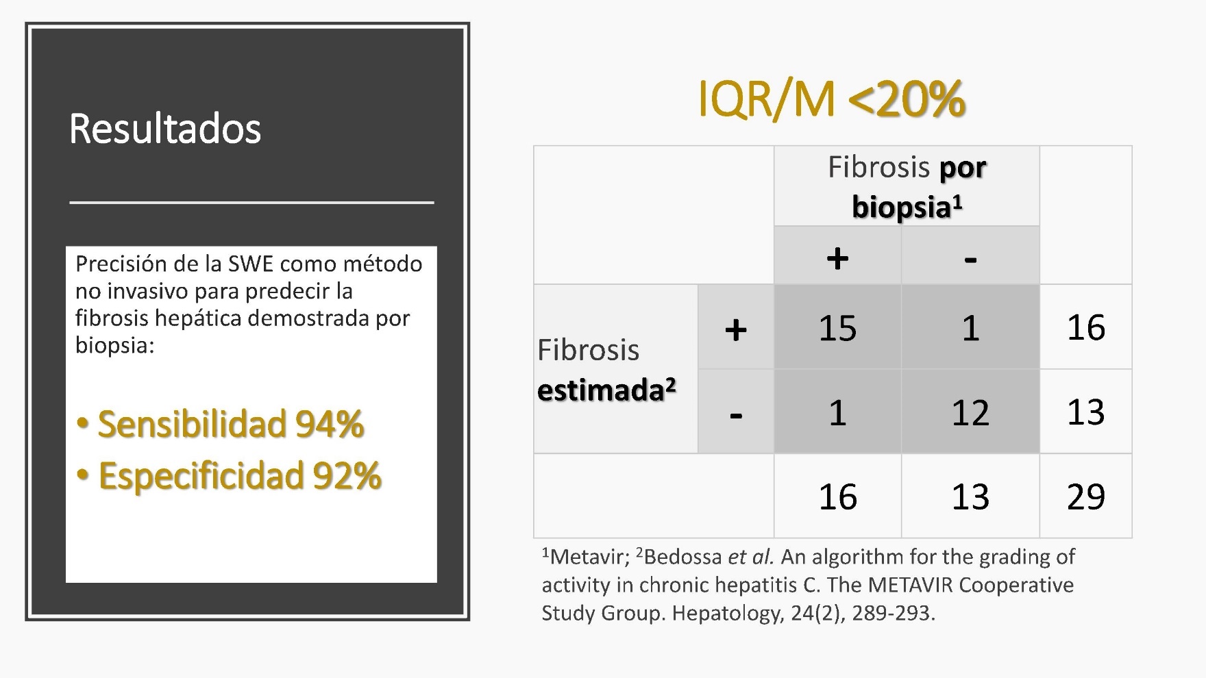 CONCLUSIÓN : SWE es un método no invasivo con excelente sensibilidad y especificidad para predecir fibrosis hepática por biopsia, siendo IQR/M <20% un punto de corte confiable.