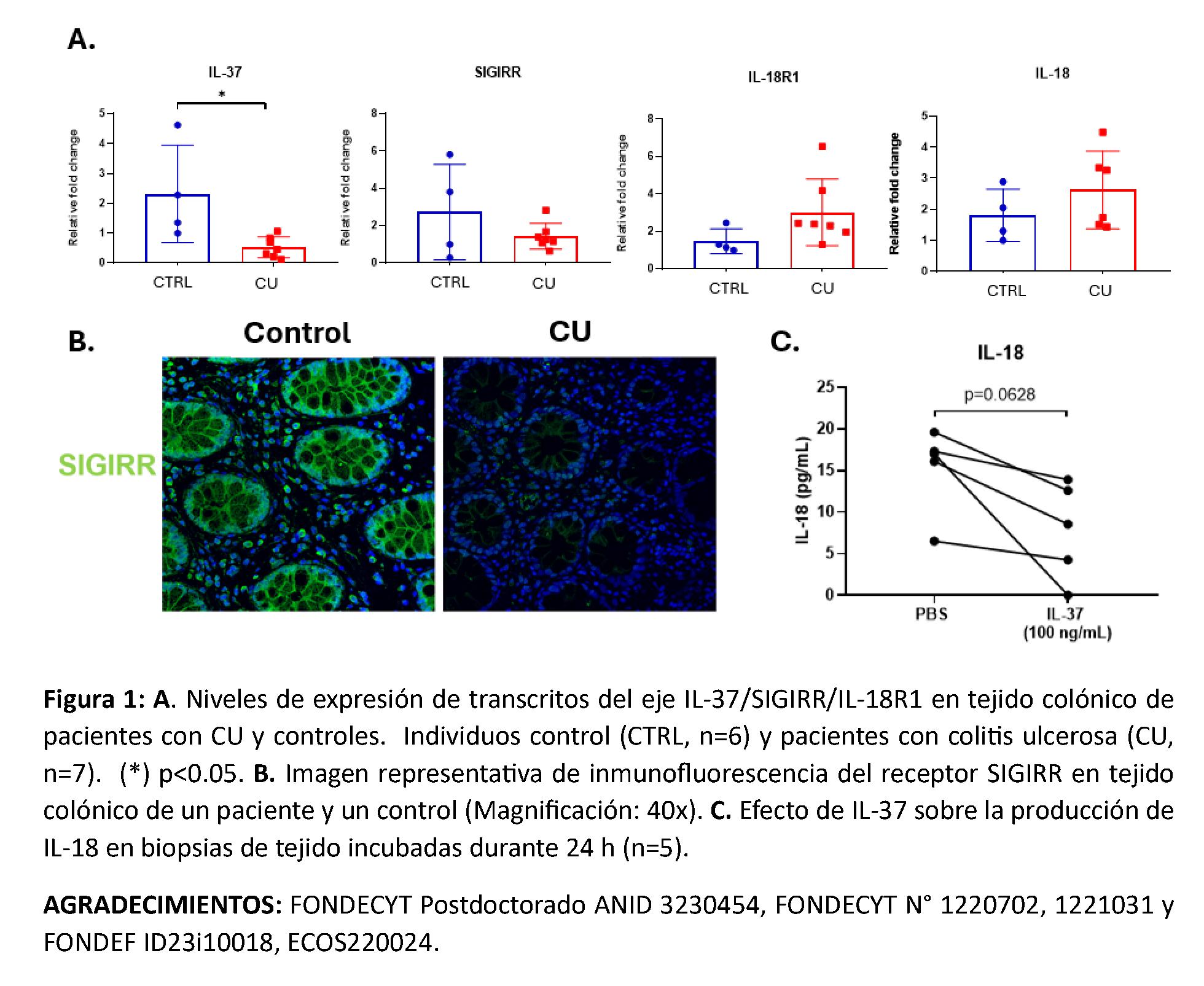 INTRODUCCIÓN: La colitis ulcerosa (CU) se caracteriza por un aumento de citoquinas proinflamatorias (IL-8, IL-18, TNF-a, entre otras) que dañan la mucosa. IL-37, citoquina antiinflamatoria, actúa mediante los receptores SIGIRR e IL-18R1 regulando la inflamación; no obstante, el rol del eje IL-37/SIGIRR en CU sigue siendo poco explorado.
