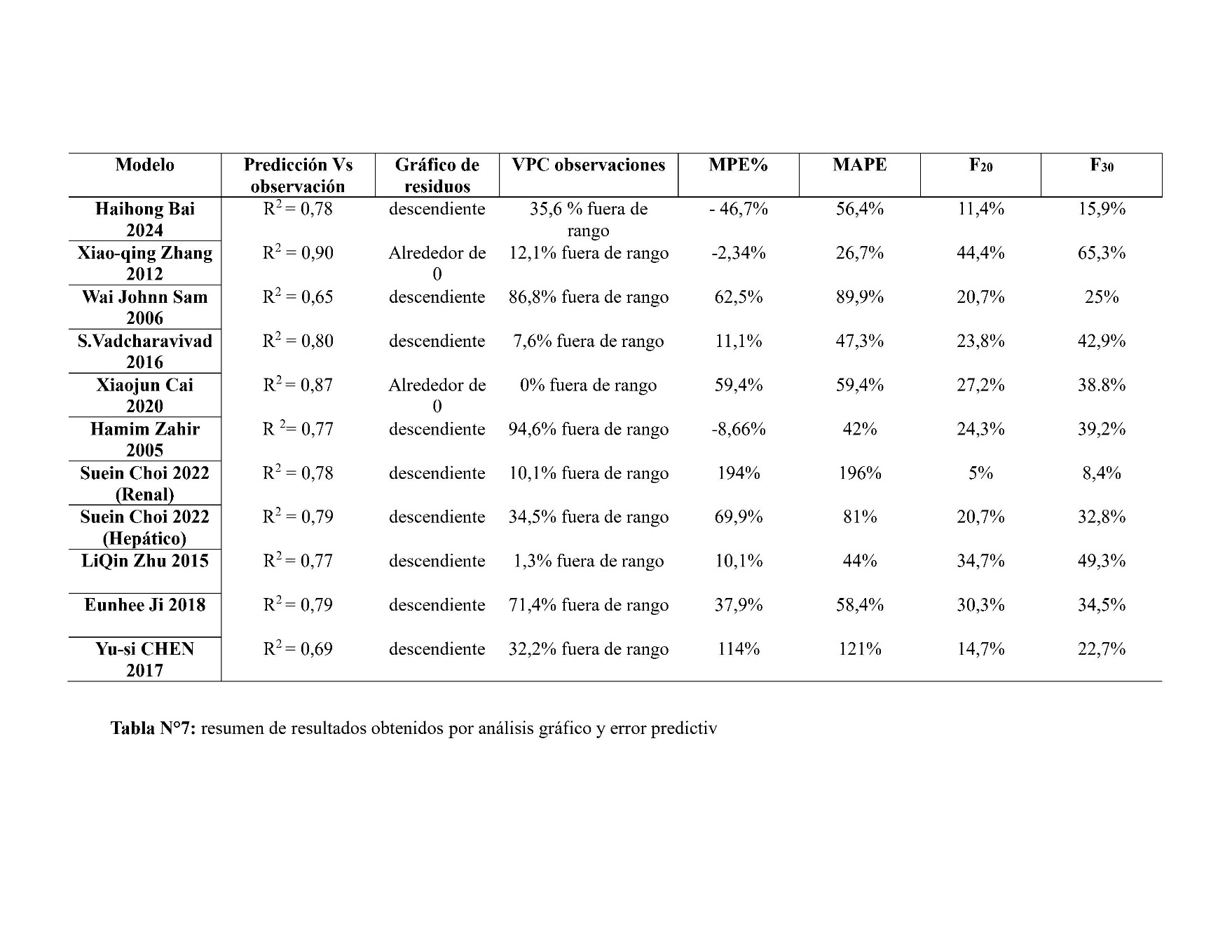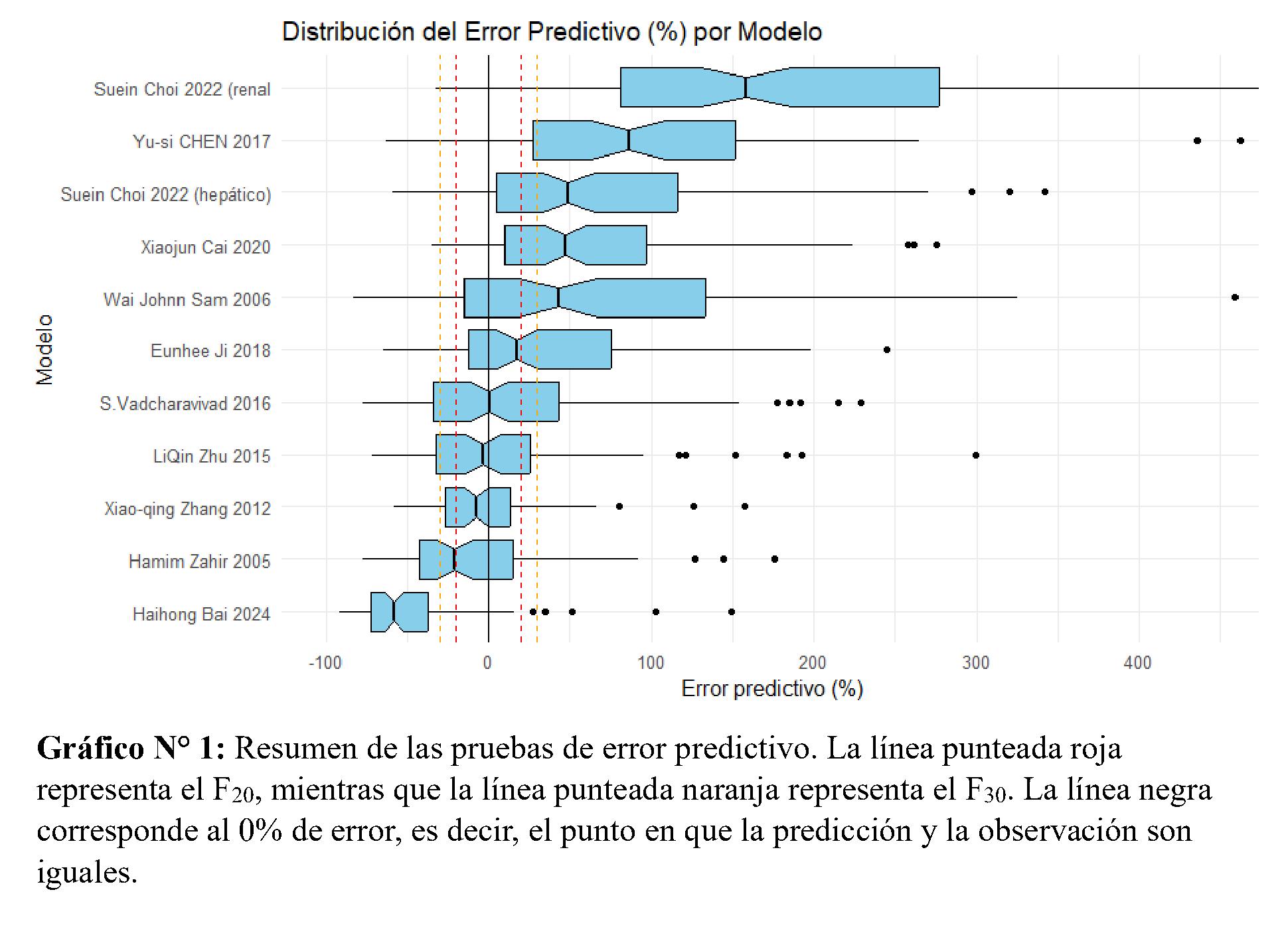 INTRODUCCIÓN: El trasplante hepático es la única alternativa en cirrosis, con una alta sobrevida y costo cercano a 50.000 USD en Chile. Optimizar la inmunosupresión reduce complicaciones y gastos. Tacrolimus, pilar terapéutico, presenta gran variabilidad farmacocinética y estrecho margen terapéutico. Los modelos farmacocinéticos poblacionales (popPK) permiten dosificación individualizada al identificar covariables que modifican la concentración plasmática, pero requieren validación local. OBJETIVOS: Seleccionar y validar modelos popPK de tacrolimus en trasplantados hepáticos ambulatorios, identificando el más robusto para aplicación clínica. MÉTODOS: Estudio retrospectivo en dos cohortes (2021-2023 y 2024). Se evaluaron 11 modelos popPK mediante bondad de ajuste, verificación predictiva visual y métricas de error predictivo (MPE, MAPE, F20, F30). El mejor modelo se aplicó en una nueva cohorte para comparar su utilidad frente a la práctica habitual. RESULTADOS: El modelo de Zhang 2012 cumplió criterios de validación, con exactitud aceptable (MPE -2,3%), precisión adecuada (MAPE 26,7%) y desempeño clínico (F20=44,4%; F30=65,3%). Las covariables hematocrito, proteínas totales y dosis diaria explicaron la capacidad predictiva. En la cohorte de validación no hubo diferencias entre concentraciones predichas y observadas (p>0,05). En la de evaluación, el modelo propuso reducción de dosis de 27,5% respecto al ajuste habitual, sin comprometer seguridad. CONCLUSIÓN: El modelo mostró aplicabilidad clínica, facilitando la dosificación personalizada de tacrolimus y optimizando recursos.
