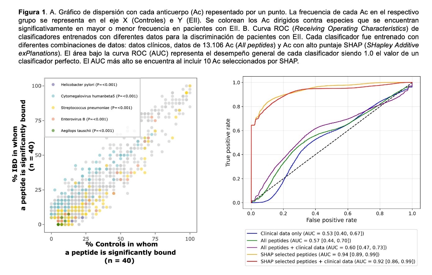 Introducción. La enfermedad inflamatoria intestinal (EII) resulta de una compleja interacción entre ambiente, microbiota y huésped. PhIP-seq (Phage Immunoprecipitation sequencing) investiga esta interacción mediante la detección de 244.000 anticuerpos (Ac) contra antígenos ambientales y microbianos. Objetivo. Comparar el repertorio de Ac detectados al diagnóstico de EII con controles sin EII y su capacidad discriminatoria. Métodos. Se reclutaron adultos sometidos a ileocolonoscopía por síntomas sugerentes de EII y se tomaron muestras de sangre para análisis con PhIP-seq. El diagnóstico de EII se basó en hallazgos endoscópicos e histológicos compatibles. Participantes con estudio normal se consideraron controles. La proporción de Ac en cada grupo se comparó con test exacto de Fisher con corrección por múltiples comparaciones. Usando machine-learning se calcularon áreas bajo la curva ROC para establecer el desempeño de clasificadores con Ac y/o factores clínicos. Resultados. Se analizaron 40 pacientes con EII y 40 controles y sus características clínicas se muestran en la Tabla 1. Se detectó un total de 13.106 Ac. Mayor frecuencia de Ac contra Citomegalovirus y Limosilactobacillus reuteri se observó en EII y contra Helicobacter pylori, Streptococcus pneumoniae, enterovirus y Aegilops tauschii en controles (Figura 1A). Un subgrupo de 10 Ac mostró una alta capacidad para discriminar pacientes con EII, superior a factores clínicos (Figura 1B). Conclusión. Una respuesta humoral distintiva y anómala a antígenos comunes podría ser clave en la patogenia de la EII. FONDECYT 1230757.
