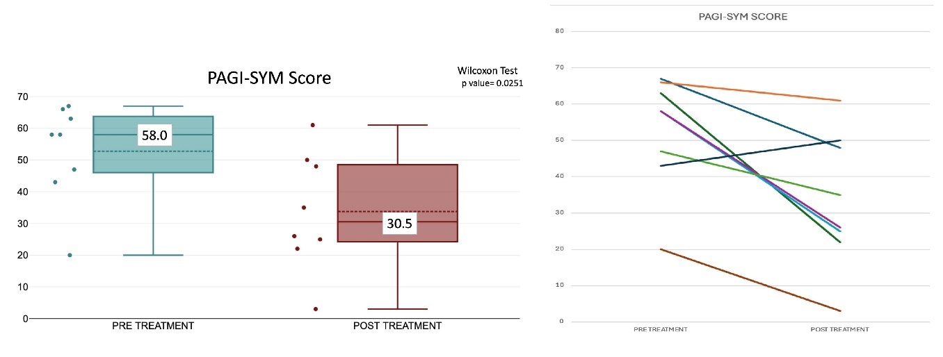 Evaluar la eficacia y seguridad del fexuprazán en pacientes con dispepsia funcional subtipo dolor epigástrico atendidos en nuestro centro. METODOLOGÍA Estudio piloto abierto de 8 semanas en adultos con diagnóstico de dispepsia funcional dolor epigástrico (Roma IV). Los participantes recibieron 40 mg diarios de fexuprazán, con seguimiento telefónico cada 4 semanas. Se evaluó respuesta clínica (Likert), síntomas (PAGI-SYM), calidad de vida (PAGI-QoL), adherencia (Morisky y conteo de comprimidos) y efectos adversos. Se excluyeron pacientes con enfermedades estructurales, cirugías gástricas previas o uso reciente de neuromoduladores, probióticos o IBP. El análisis se realizó con SPSS v.29 usando prueba de Wilcoxon.RESULTADOS Se incluyeron 12 pacientes (8 mujeres), edad promedio 33 años. PAGI-SYM promedio disminuyó de 58,0 a 30,5 tras 8 semanas (p = 0,02). No hubo cambios relevantes en calidad de vida ni efectos adversos. La adherencia fue del 100%. CONCLUSIÓN El fexuprazán mostró eficacia, seguridad y buena tolerancia en DF dolor epigástrico. Estos resultados preliminares respaldan estudios controlados más amplios para confirmar su utilidad clínica.