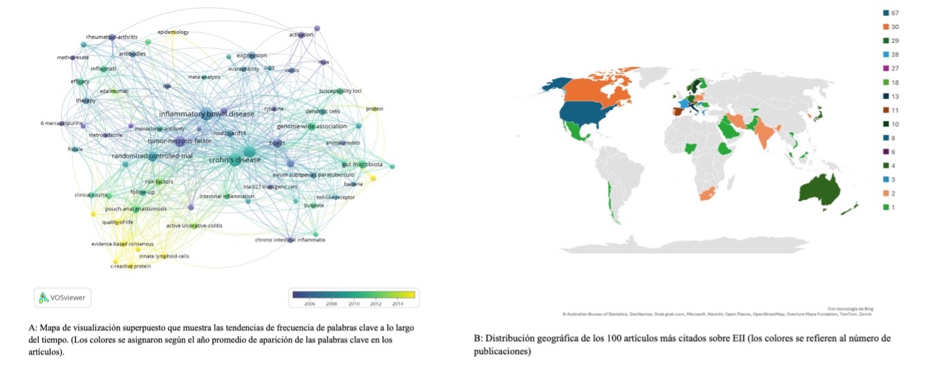 INTRODUCCIÓN: La Enfermedad Inflamatoria Intestinal (EII) incluye la colitis ulcerosa y la enfermedad de Crohn, y su investigación ha evolucionado significativamente en las últimas décadas. Los análisis bibliométricos permiten identificar tendencias y estudios influyentes. OBJETIVOS: Analizar las características y tendencias de los 100 artículos más citados en EII publicados entre 1975 y 2025. MÉTODOS: Estudio bibliométrico basado en la base Web of Science Core Collection. Se identificaron los artículos más citados y se analizaron año, país, institución, revista, autores y coocurrencia de palabras clave mediante VOSviewer. RESULTADOS: Los artículos tuvieron entre 1.001 y 4.386 citas, con mediana de 1.506,5. El más citado abordó variantes del gen NOD2 en Crohn. EE.UU. lideró en producción (67 artículos), seguido de Canadá y Europa. Harvard y la Universidad de Chicago fueron las instituciones más productivas. Las líneas de investigación evolucionaron desde genética e inmunología hacia microbiota, manejo clínico y resultados centrados en el paciente. Latinoamérica estuvo poco representada (Chile único país). CONCLUSIÓN: La producción de alto impacto en EII se concentra en países con gran infraestructura investigadora. Se observa una transición hacia terapias personalizadas y resultados centrados en el paciente, destacando la necesidad de mayor representación latinoamericana en la investigación global.