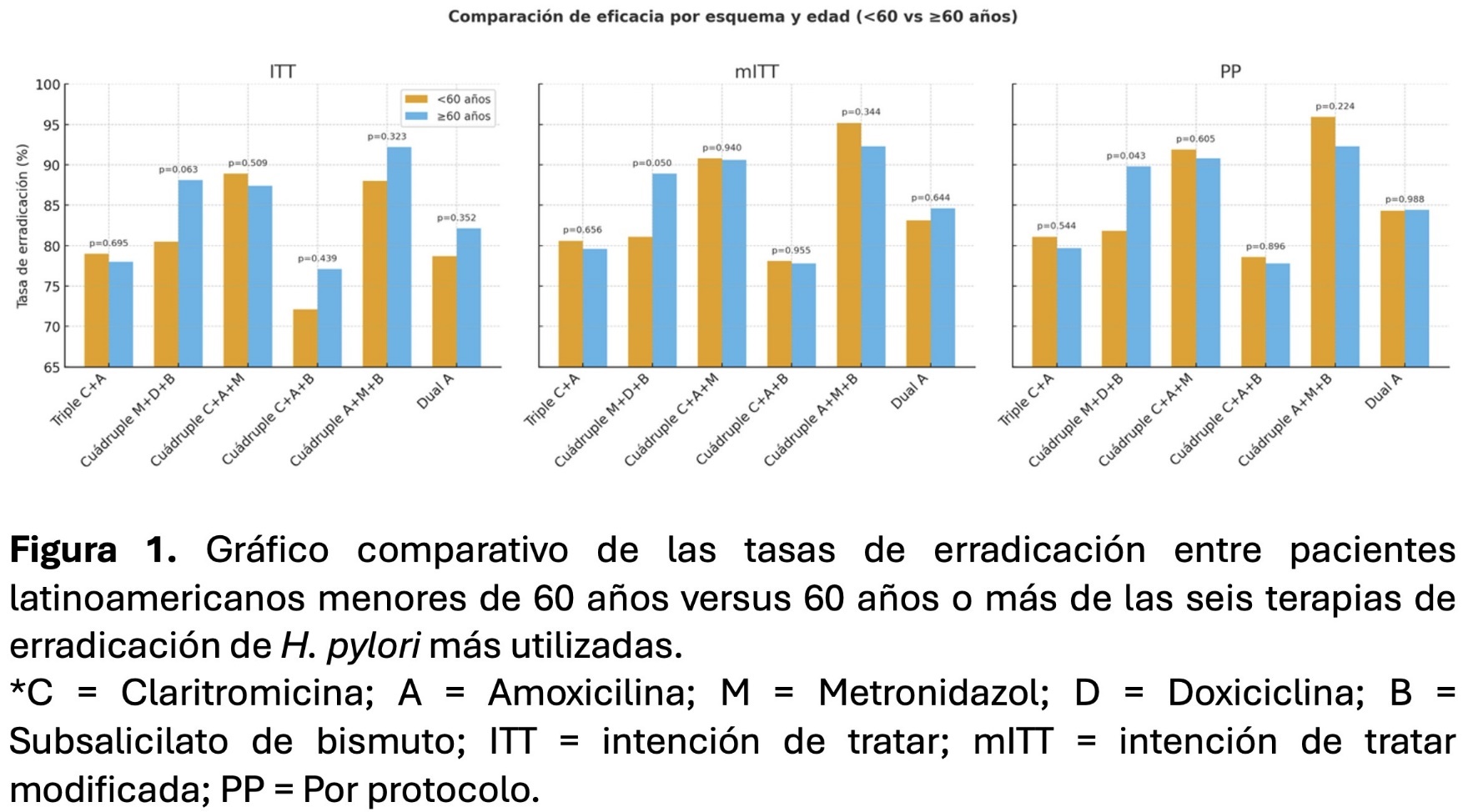 CONCLUSIÓN: En Latinoamérica, la eficacia de la erradicación de Hp es similar entre <60 y >60 años, aunque los pacientes mayores reportan menos efectos adversos. Las terapias triples y duales continúan siendo insuficientes, consolidándose las cuádruples con o sin bismuto como esquemas de primera línea óptimos.