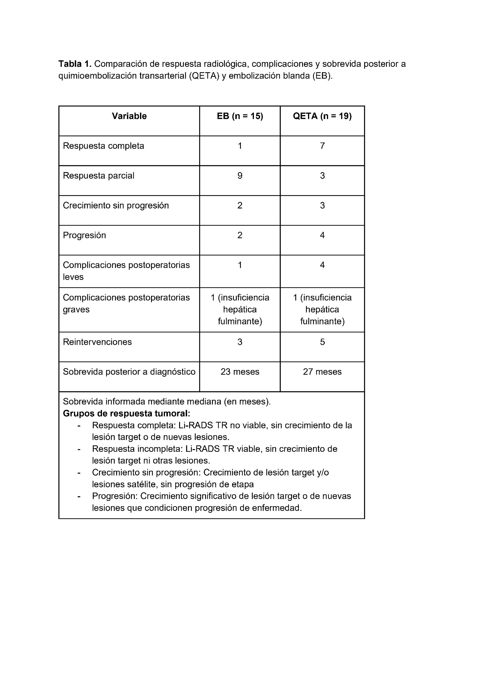 Introducción: La quimioembolización transarterial (QETA) es el tratamiento de elección para el hepatocarcinoma (HCC) estadio intermedio; sin embargo, estudios recientes reportan similares tasas de respuesta, sobrevida y menores reacciones adversas con embolización blanda (EB). Objetivo: Comparar eficacia, sobrevida y seguridad de QETA y EB para el tratamiento de HCC. Métodos: Estudio observacional retrospectivo de pacientes tratados mediante QETA o EB para HCC en el Hospital de Puerto Montt entre 2018 y 2025. Se realizó un control con resonancia magnética a las 6 semanas. Resultados: Se incluyeron 28 pacientes (15 hombres), de edad promedio 69 años, con daño hepático principalmente de etiología metabólica. Se realizaron 19 QETA y 15 EB, con 5 complicaciones leves (4 en QETA) y 2 fatales (1 QETA y 1 EB). Ambos métodos lograron similar tasa de respuesta favorable (63% vs 71%); sin embargo, QETA logró mejor tasa de respuesta completa (9 (50%) vs 1 (7%)) y mayor sobrevida (27 vs 23 meses). No se identificó asociación entre Child-Pugh, etiología ni sexo con desenlaces clínicos-radiológicos. La presencia de una única lesión se asoció a mejor respuesta, mientras que no haber logrado un 100% de avascularización en el procedimiento se asoció a peor respuesta. Conclusiones: QETA continúa siendo una opción terapéutica preferente, con tendencia a mejor respuesta tumoral y sobrevida respecto a EB, aunque más costosa y con mayor riesgo de complicaciones, por lo que EB aún debe considerarse como una alternativa, especialmente en pacientes frágiles o centros con menor presupuesto.