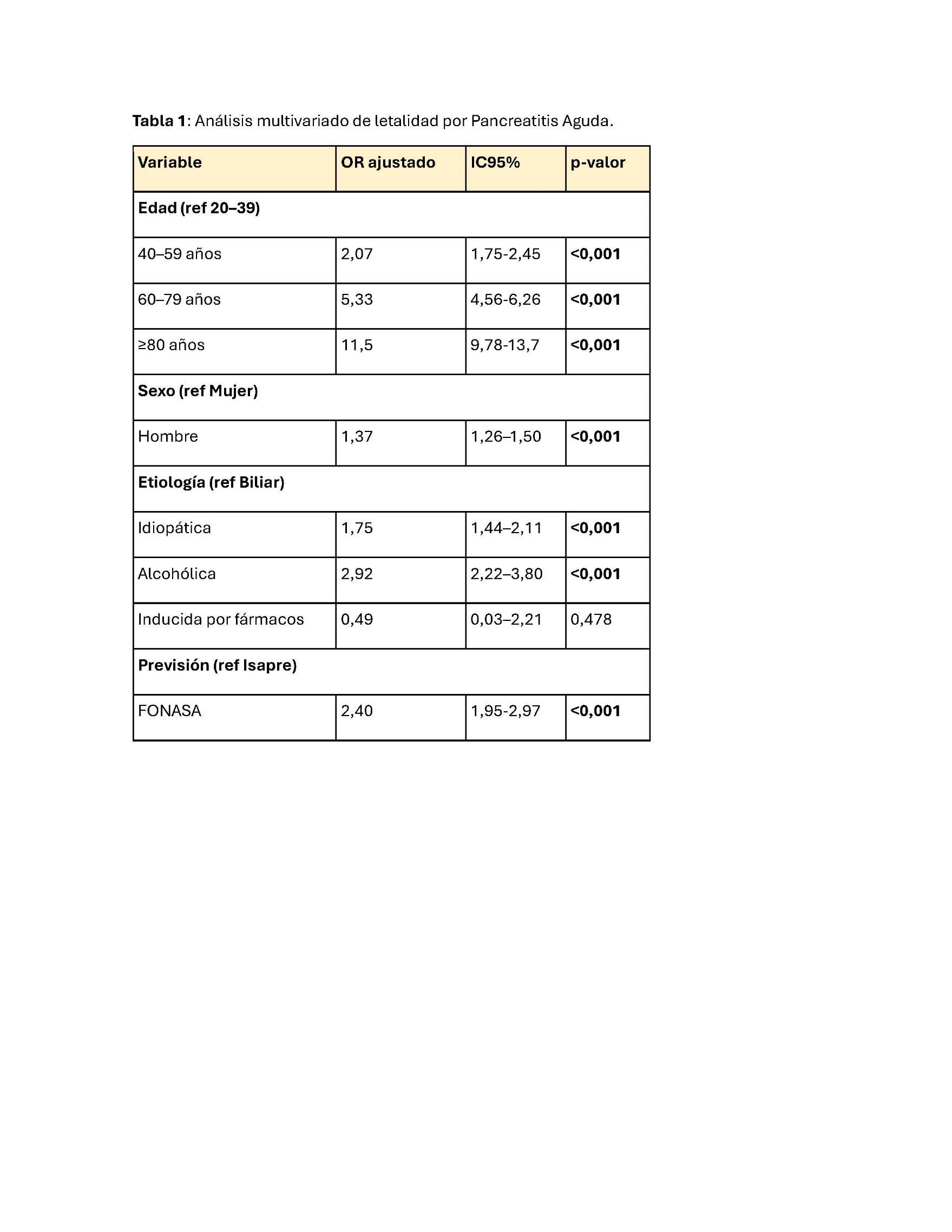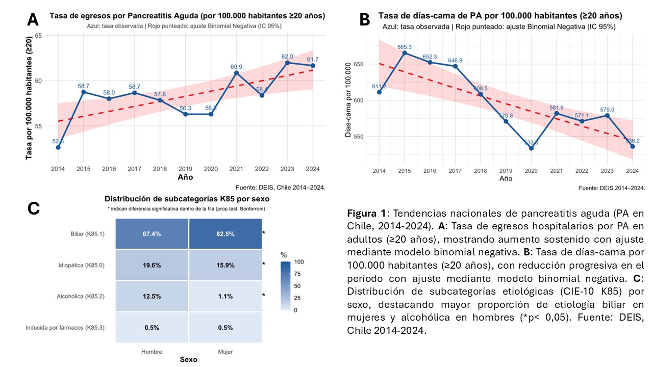 Introducción: La pancreatitis aguda (PA) es una causa frecuente de hospitalización y morbimortalidad, con incidencia al alza. En Chile, la información epidemiológica actualizada es limitada. Objetivos: Describir epidemiología, letalidad e impacto hospitalario de la PA en Chile. Métodos: Estudio descriptivo de egresos hospitalarios de adultos registrados en el DEIS (2014-2024) con diagnóstico principal de PA (CIE-10). Se analizaron tasas, etiología, letalidad y días-cama. Se utilizó test de proporciones para diferencia de etiología por sexo y modelo binomial negativa para tendencia de tasas. Resultados: Se registraron 90.116 egresos por PA, 54,3% mujeres y 62% tenía entre 20-59 años. La tasa de hospitalización anual fue 58,4/100.000 habitantes con aumento de 0,97% anual. Las principales etiologías fueron biliar (76%), idiopàtica (18%) y alcohólica (6%), con diferencias significativas por sexo (Fig 1). La letalidad global fue 2,6%, factores de riesgo en análisis multivariado fueron mayor edad, sexo masculino, etiología alcohólica y previsión FONASA (Tabla 1). Hubo tendencia a disminución de la letalidad (2,3% anual), media de estadía hospitalaria (11,6 a 8,7 días) y días-cama por 100.000 habitantes (665 a 536). Conclusión: En Chile, la PA muestra un aumento sostenido de hospitalizaciones, predominando en adultos en edad laboral. La mortalidad afecta principalmente a adultos mayores, aunque ha disminuido en la última década. Pese a la reducción en los días de hospitalización, la carga asistencial sigue siendo significativa, subrayando su relevancia para el sistema de salud.