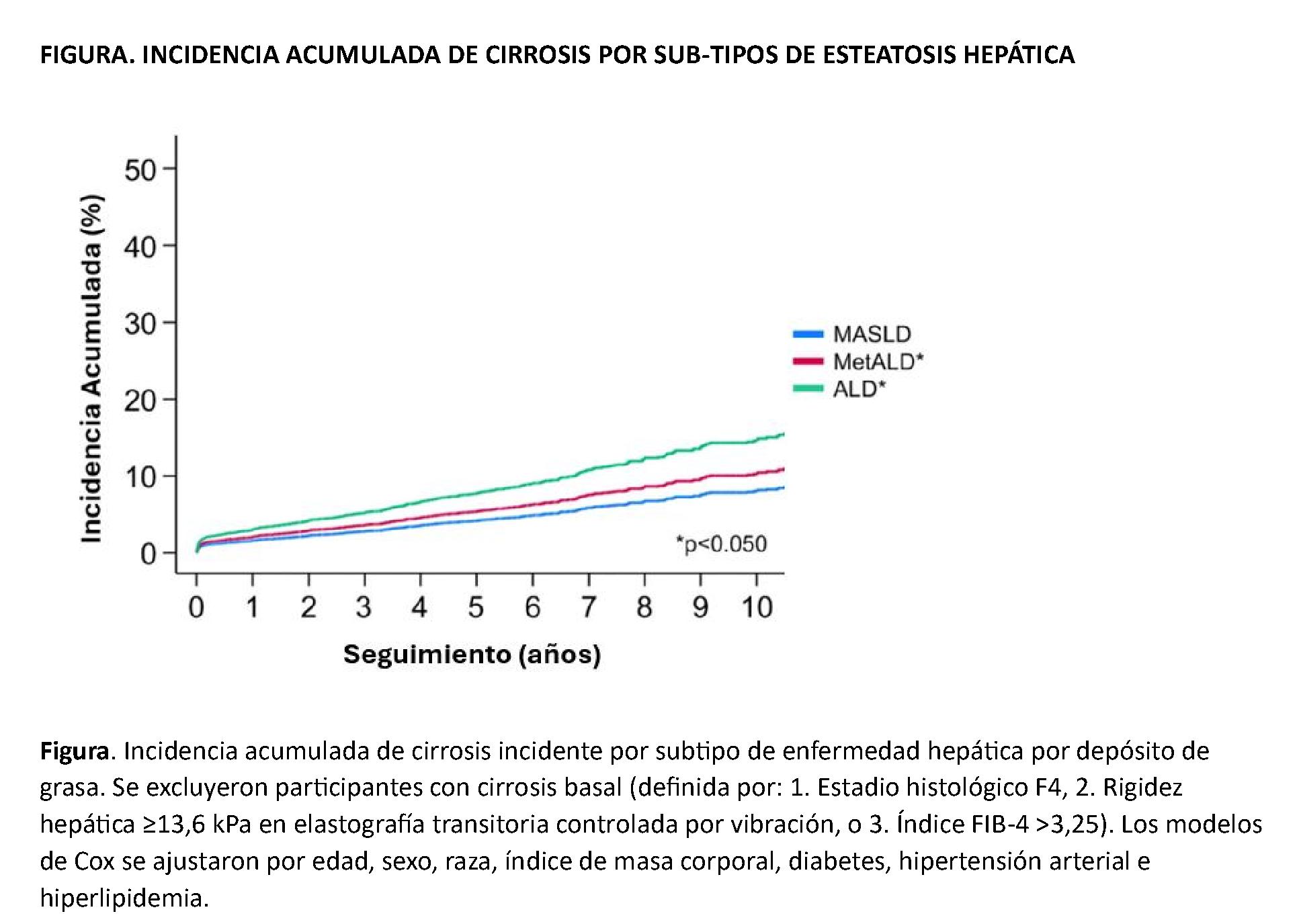 La edad media fue 61 años; 52,8% hombres. Al inicio, el 12,2% tenía biopsia hepática compatible con cirrosis (F4) o ET/FIB-4 sugerente de cirrosis. Durante un seguimiento de 2,1 años el 0,9% progresó a cirrosis, 0,4% tuvo descompensación hepática y 1,3% presentó CHC. MetALD y ALD mostraron mayor riesgo de progresar a cirrosis y de descompensación hepática. La incidencia de CHC fue mayor en ALD que en MASLD. CONCLUSIÓN: En esta cohorte, MetALD y ALD se asociaron con progresión más rápida a cirrosis y mayores tasas de descompensación que MASLD. Estos hallazgos podrían respaldar intervenciones tempranas en MetALD y ALD.