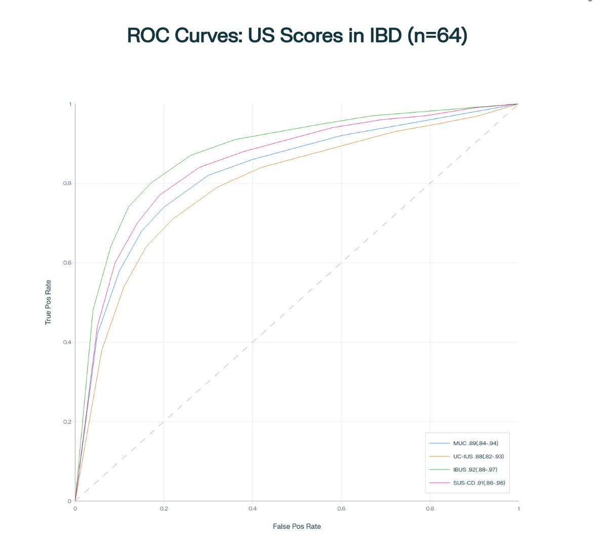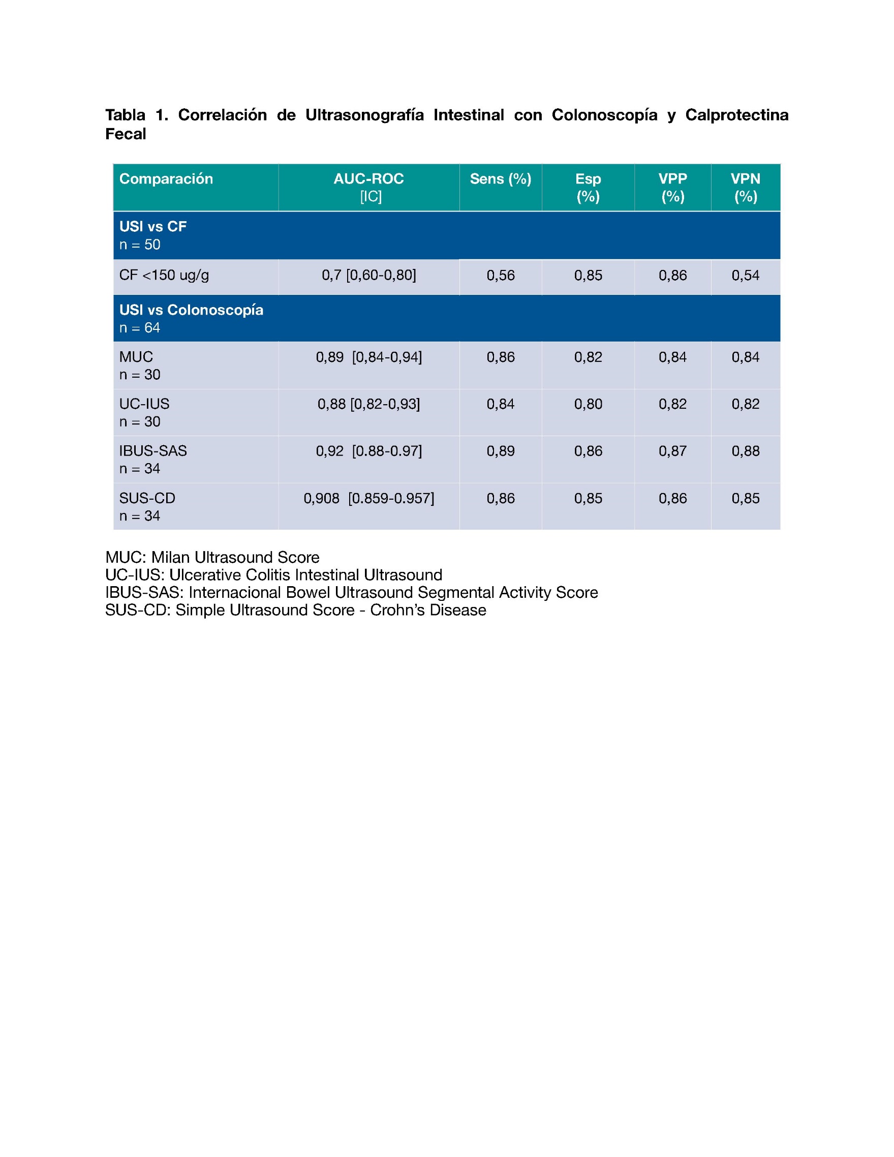 Introducción: La estrategia “tratamiento por objetivos” ha reforzado la necesidad de monitorización objetiva en la enfermedad inflamatoria intestinal (EII), donde el ultrasonido intestinal (USI) se posiciona como alternativa no invasiva y costo-efectiva. Objetivos: Evaluar la correlación entre los parámetros de USI con los índices endoscópicos y calprotectina fecal (CF), y analizar el rendimiento de los parámetros ecográficos. Métodos : Estudio prospectivo en pacientes con EII atendidos en Clínica Universidad de los Andes entre marzo y agosto de 2025, con USI, CF y colonoscopia realizada en un período <30 días. Se consideró remisión biomarcador CF<150 ug/g; endoscópica IME/UCEIS 0 para colitis ulcerosa (CU) y SES-CD<2 y Rutgeerts i0/i1 para enfermedad de Crohn (EC) y remisión USI un MUC<6.2 y IBUS-SAS<23.8. Resultados : Se incluyeron 64 pacientes, 53% con EC, edad mediana 41 años, 66% mujeres, 38% solicitado como seguimiento y el resto por actividad. USI mostró alta correlación con colonoscopía (tabla 1), con el mejor rendimiento para IBUS-SAS en EC. La combinación de variables clínicas aumenta la precisión diagnóstica: 93% para IUS + CF, y 96% al agregar además actividad clínica. El mejor parámetro ecográfico para predecir actividad inflamatoria fue el espesor de la pared, seguido de la presencia de focos vasculares.
