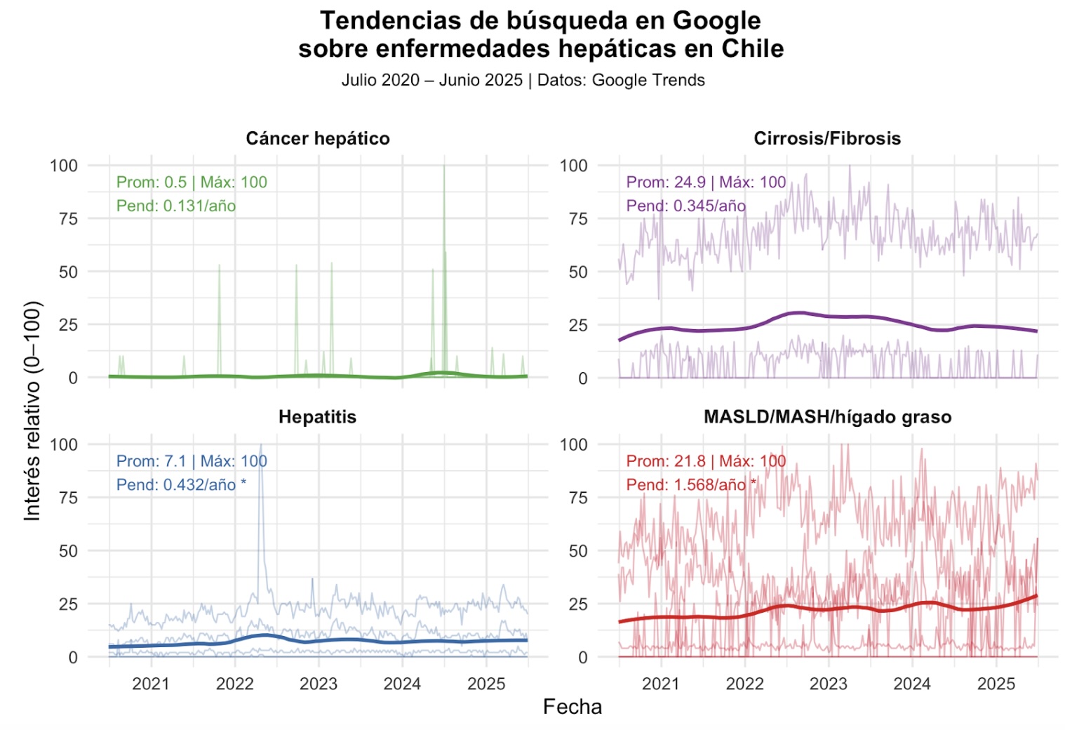 Google Trends ofrece datos abiertos sobre volumen relativo de búsquedas. OBJETIVOS: Analizar tendencias de búsqueda en Google sobre enfermedades hepáticas en Chile, identificando categorías más consultadas y cambios temporales. MÉTODOS: Estudio descriptivo con datos de Google Trends, base de datos abiertos sobre volumen relativo de búsquedas. Se analizaron datos para Chile (julio 2020-junio 2025). Se buscaron múltiples términos agrupados en cuatro categorías: MASLD/MASH/hígado graso (MASLD), hepatitis, cirrosis/fibrosis y cáncer hepático. Se usó el interés relativo (0-100) para calcular promedios, máximos y tendencias mediante regresión lineal y modelos ARIMA semanales. RESULTADOS: MASLD mostró el mayor interés promedio (21,8) y una tendencia creciente significativa (+1,57 puntos/año; p<0,001). Cirrosis/fibrosis mantuvo tuvo interés elevado (24,9) sin cambios (p=0,65). Hepatitis presentó un promedio de 7,1 con aumento significativo (+0,43 puntos/año; p=0,02). Cáncer hepático tuvo el menor interés (0,5) sin cambios (p=0,21). El modelo ARIMA confirmó una tendencia creciente no lineal en MASLD. CONCLUSIONES: En este primer análisis de interés digital en enfermedades hepáticas en Chile, las búsquedas se concentraron en MASLD y cirrosis, mientras que el cáncer hepático mantuvo bajo interés pese a su relevancia clínica. Incorporar métricas de salud digital puede guiar campañas educativas y orientar políticas de educación en hepatología.