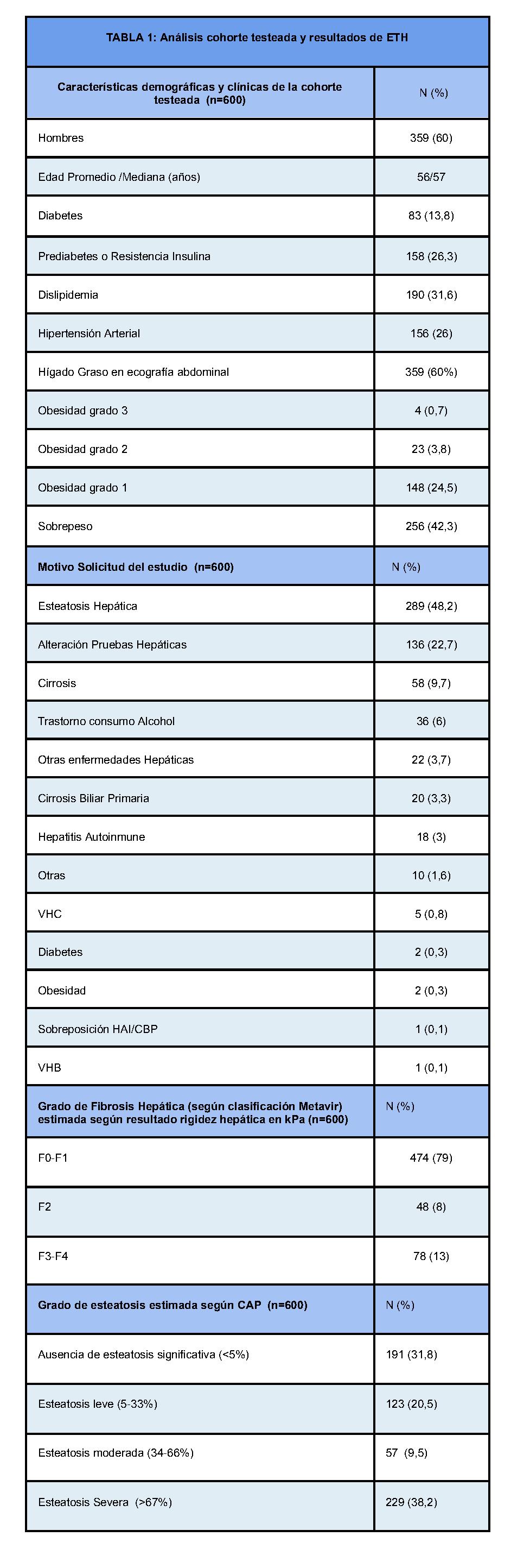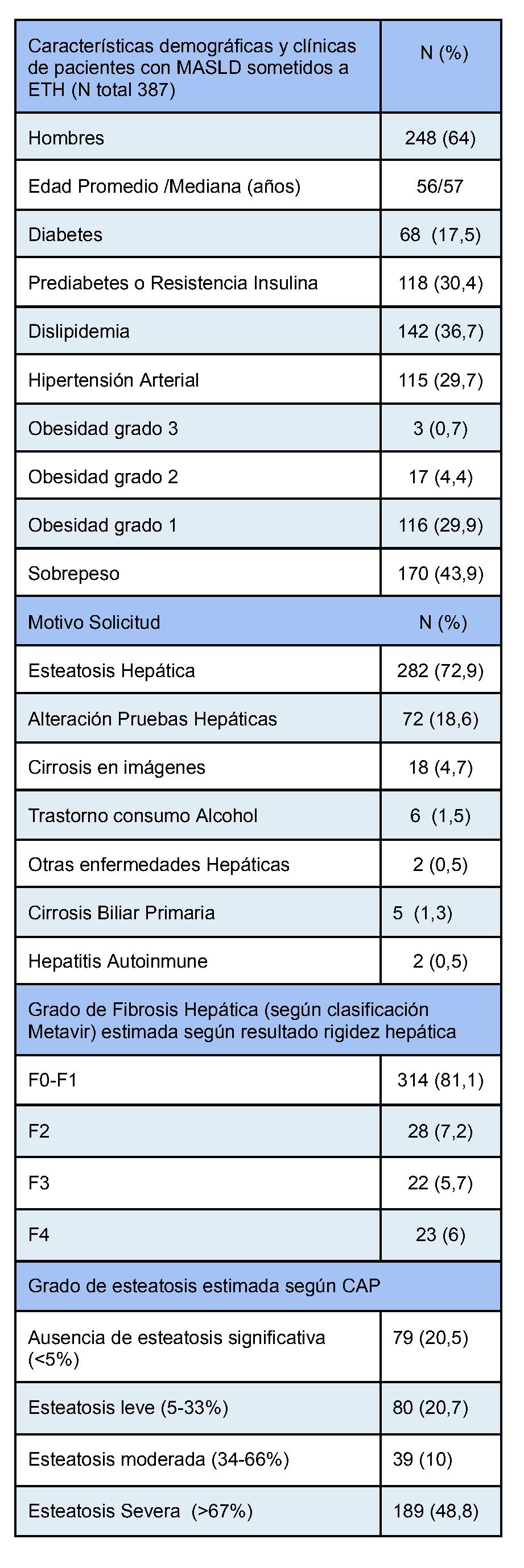 INTRODUCCIÓN: En la enfermedad hepática esteatósica asociada a disfunción metabólica (MASLD) se recomienda estimar el grado de fibrosis hepática (FH) a través de métodos no invasivos como la elastografía de transición hepática (ETH) para evaluar el estadio y riesgo de progresión. OBJETIVO: Evaluar las características demográficas y clínicas de pacientes con MASLD derivados a ETH. MÉTODOS: Análisis descriptivo de los resultados de ETH realizados a pacientes con diagnóstico o sospecha de MASLD de septiembre 2022 a Agosto 2025 en una institución privada de Santiago. RESULTADOS: De 600 informes revisados, 387 (64,5%) fueron pacientes con MASLD. En estos, la edad media fue de 56 años y el 64% de sexo masculino. La principal indicación de solicitud fue esteatosis hepática (72,1%), seguida por alteración de pruebas hepáticas (18,6%). Factores de riesgo más frecuentes: sobrepeso (43,9%), dislipidemia (36,7%), obesidad Grado 1 (29,9%), Hipertensión Arterial (29,7%) y Diabetes Mellitus (17,5%). Estimación del grado de FH según el resultado de rigidez hepática: en 314 (81,1%) se estimó con grado F0-F1 (sin FH significativa), 28 (7,2%) con F2 (FH significativa), 22 (5,7%) F3 (FH avanzada) y 23 pacientes (6 %) con F4 (cirrosis hepática). La medición de CAP promedio de la cohorte fue de 279 dB/m. En el 49% se estimó esteatosis severa. Los pacientes con diabetes presentaron un promedio de 6,9 Kpa vs 6,7 Kpa en otros grupos de riesgo metabólico, y un CAP promedio de 277 dB/m vs 280 dB/m respectivamente. CONCLUSIÓN:La ETH es una técnica útil para evaluación de FH en pacientes con MASLD.
