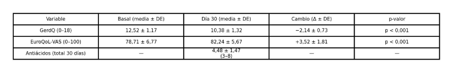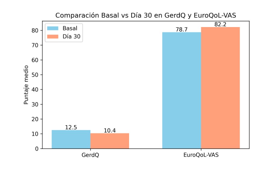 Introducción: La enfermedad por reflujo gastroesofágico (ERGE) es una afección prevalente, los síntomas típicos se presentan en hasta el 33 % de la población adulta. Aunque los inhibidores de bomba de protones (IBP) son la terapia de primera línea, alrededor del 30 % de los pacientes no logra controlar sus síntomas. Esta limitada eficacia farmacológica ha motivado la búsqueda de estrategias complementarias. La respiración diafragmática fortalece el esfínter esofágico inferior y podría reducir el reflujo al incrementar su presión; ensayos previos han mostrado disminuciones de 2-3 puntos en GerdQ y una respuesta clínica > 60 %. Objetivo: Evaluar la respuesta clínica de la respiración diafragmática en adultos ERGE sin uso de IBP. Material y Métodos: Ensayo cuasi experimental con 21 pacientes de edad 43 + 8 años. Se aplicaron GerdQ y EuroQoL-VAS al inicio y día 30. Los participantes realizaron 2 sesiones diarias de 20 min durante 30 días. Se compararon los cambios con t pareada. Se registró el uso de antiácidos de rescate. Resultados: GerdQ bajó de 12,5 ± 1,2 a 10,4 ± 1,3 (△ = -2,14 ± 0,73; p < 0,001). EuroQoL-VAS subió de 78,7 ± 6,8 a 82,2 ± 5,7 (△ = +3,5 ± 1,8; p < 0,001). Diecinueve pacientes (90 %) redujeron >2 puntos. El uso promedio de antiácidos fue 4,5 ± 1,5 dosis (3-8). La adherencia fue 88 %. . Conclusión: La respiración diafragmática mejoró los síntomas y la percepción de salud en pacientes con ERGE sin uso de IBP . Esto sugiere que la técnica podría ser una estrategia complementaria segura; se requieren estudios controlados para confirmar su beneficio.