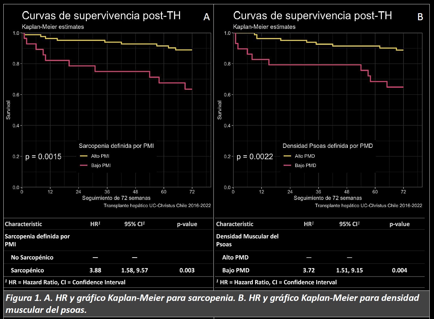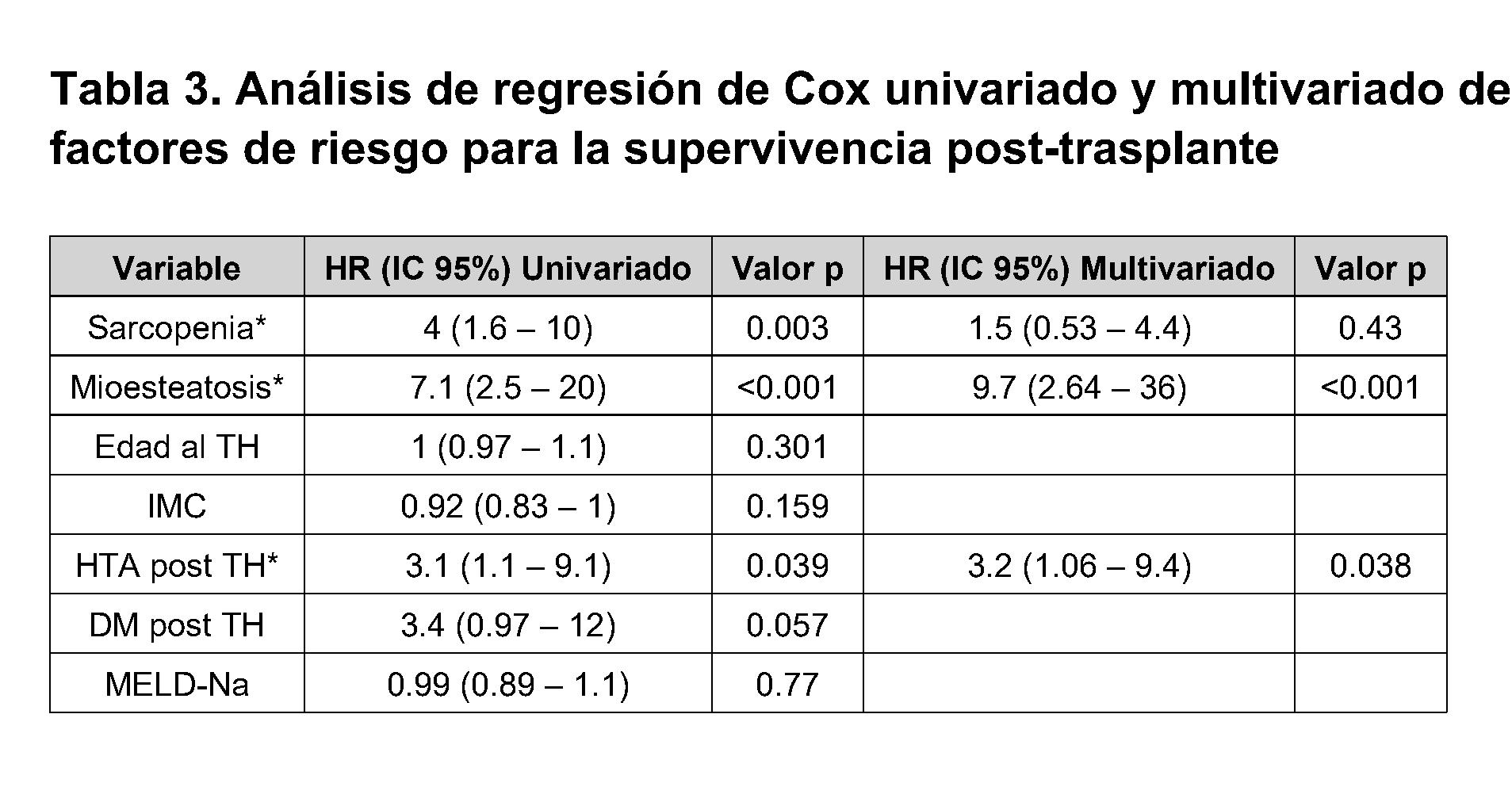 RESULTADOS: Se incluyeron 111 pacientes: 63 sin alteraciones, 9 con sarcopenia, 22 con mioesteatosis, 17 con ambas. La mortalidad a 72 semanas fue 3,2%, 22%, 27% y 47% respectivamente (p<0,001). En el análisis multivariado, la mioesteatosis se asoció a mayor mortalidad (HR 9,7; IC95% 2,64-36; p<0,001), mientras que la sarcopenia no fue significativa. La hipertensión post-TH también aumentó riesgo (HR 3,2; p=0,038). CONCLUSIÓN: La mioesteatosis, sola o combinada con sarcopenia, es un predictor independiente de mortalidad y peor evolución post-TH. Su evaluación sistemática en la práctica clínica podría optimizar la selección y manejo de candidatos a trasplante.