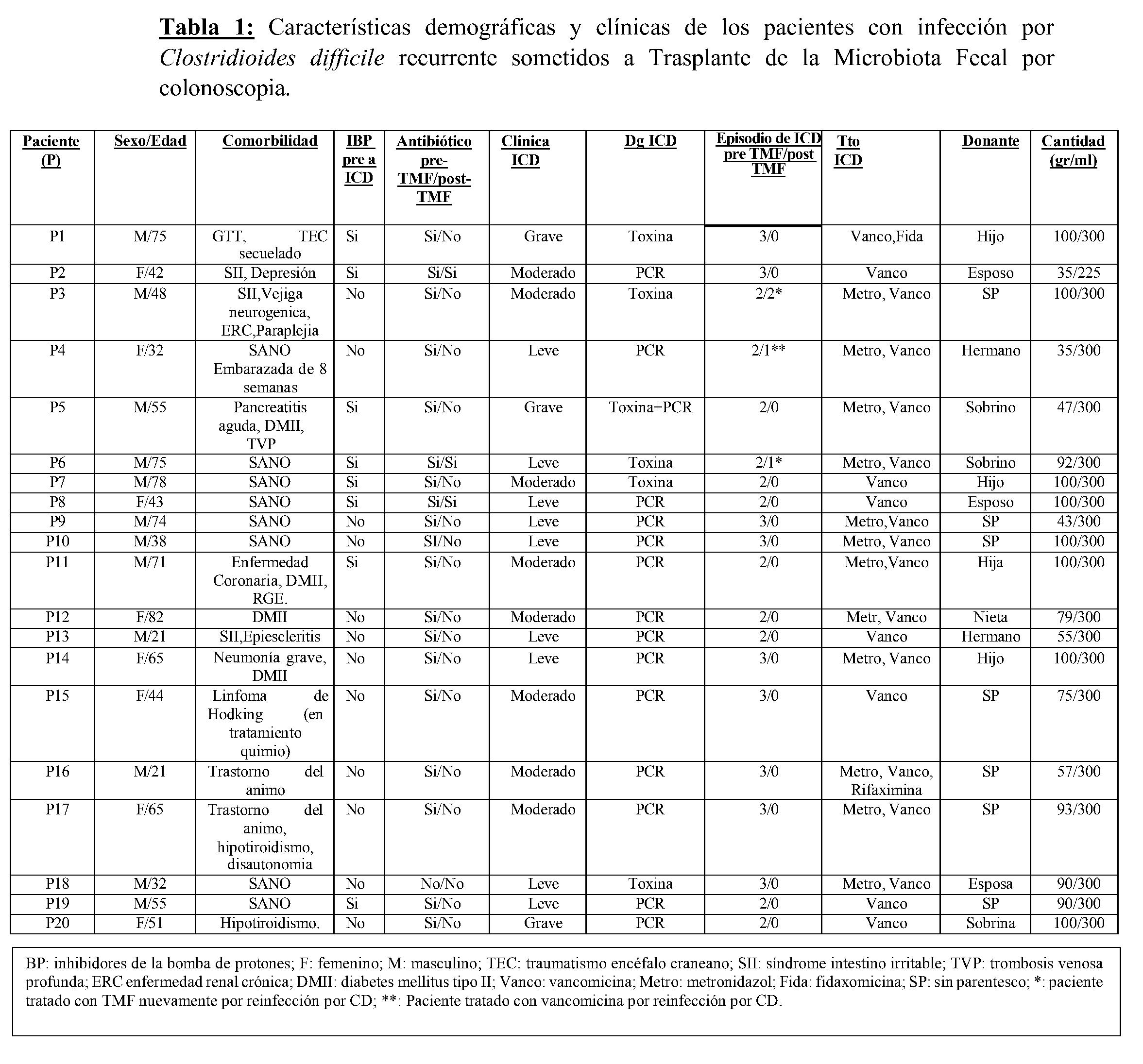 RESULTADOS: El TMF ha sido realizado en 20 pacientes (12 hombres), con una mediana de edad 53 años (rango 21-75). La efectividad del TMF ha sido de un 100 %. En el seguimiento (mediana 6 meses, rango 6-24 meses), solo tres pacientes han presentado un nuevo episodio de ICD después de las 8 semanas del TMF, en dos casos se realizó un nuevo TMF con una evolución favorable. Ningún paciente ha presentado un evento adverso grave post TMF. Todos los pacientes han referido una percepción positiva del tratamiento. Las características clínicas se muestran en la Tabla-1.