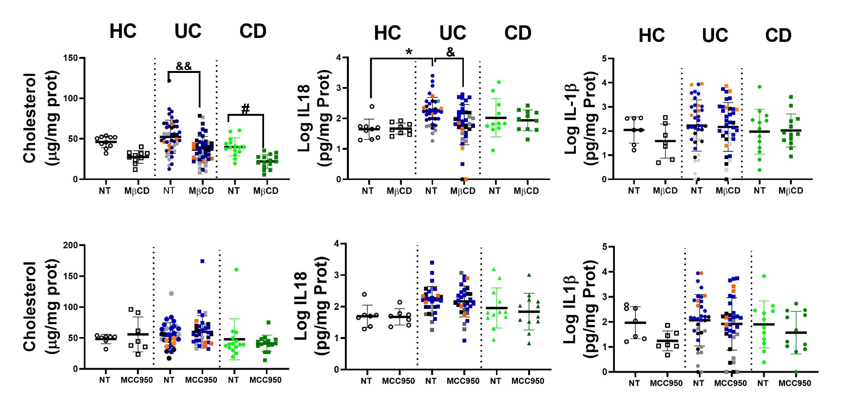 RESULTADOS: Se observó sobreexpresión de genes de transporte de colesterol y LDL-R en CU y EC, con disminución de ABCA1/ABCG1. Niveles de NLRP3, IL-ip e IL-18 estaban elevados. No se observaron cambios entre los grupos CU y EC. En CU, MpCD redujo colesterol e IL-18 (p<0,05), sin afectar IL-1p; sin efecto en EC. MCC950 inhibió la activación del inflamasoma inducida por colesterol en macrófagos (p<0,0001), pero no en explantes.