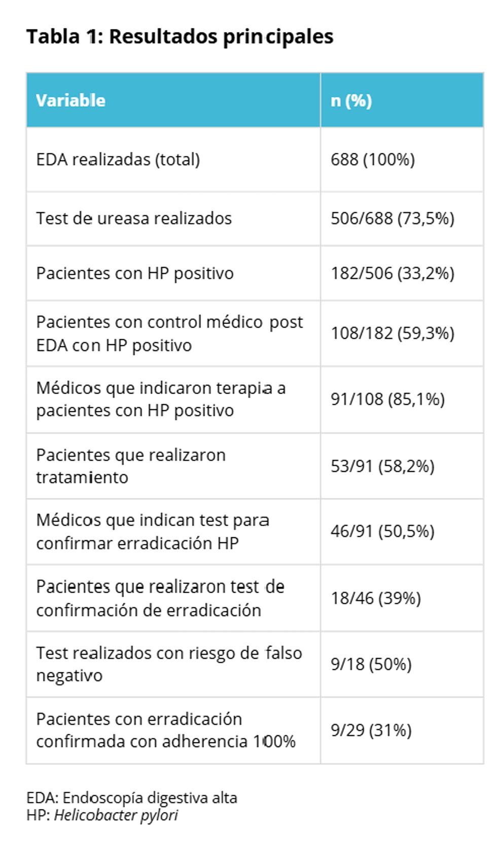 INTRODUCCIÓN : El cáncer gástrico es una de las principales causas de muerte en Chile, donde Helicobacterpylori (HP) es el principal factor de riesgo. Al erradicar HP se reduce la incidencia de cáncer gástrico. En Chile la erradicación de HP está garantizado por el Ministerio de Salud en un documento publicado el 2013. OBJETIVOS : evaluar la frecuencia de HP en nuestro centro en los pacientes que se realizaron endoscopia digestiva alta (EDA) y describir el proceso hasta su erradicación. MÉTODOS : estudio retrospectivo en Clínica Dávila (mayo-julio 2024) en adultos que se realizaron EDA, con HP confirmado por test de ureasa o biopsia. Se revisaron fichas clínicas para evaluar motivo de la EDA, hallazgos principales, adherencia a controles e indicaciones médicas respecto a erradicación de HP. Se contó con aprobación del comité de ética científico. RESULTADOS: de 688 endoscopías, 33,2% fueron positivas para HP. A 91 pacientes se les indicó tratamiento, esquema más prescrito fue triterapia (53,8%) (figura 1). El 50% de los pacientes asistió a control posterior a la indicación de erradicación, con adherencia completa al tratamiento en 29 pacientes. En 9 de ellos se confirmó erradicación sin riesgos de falsos negativos (31%). Detalles de resultados en tabla 1. CONCLUSIÓN: la erradicación de HP en nuestro centro es inferior al estándar internacional debido a diferentes brechas. Urge actualizar la guía nacional en cuanto a terapia, indicación de erradicación universal tras la pesquisa de HP y contar con programas de prevención para impactar en la incidencia del cáncer gástrico.
